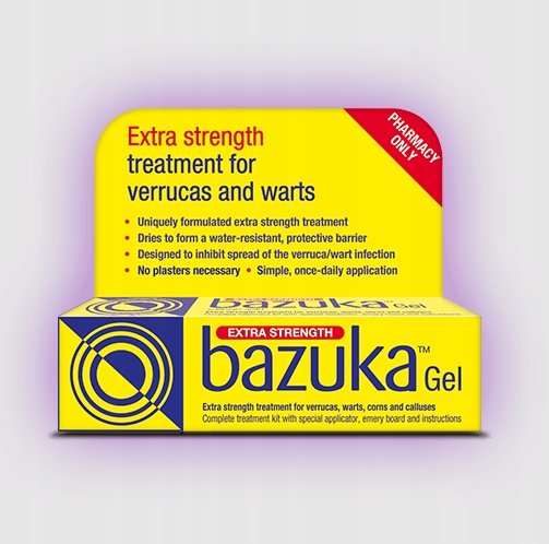 BAZUKA GEL EXTRA STRENGTH to specjalistyczny żel o mocniejszym działaniu, przeznaczony do skutecznego usuwania brodawek, kurzajek, odcisków i modzeli. Jego unikalna formuła zawiera kwas salicylowy, który delikatnie usuwa zainfekowaną tkankę skórną, pomagając eliminować wirusa. Żel po wyschnięciu tworzy wodoodporną, ochronną barierę, która hamuje rozprzestrzenianie się infekcji. Dzięki temu nie potrzebujesz żadnych plastrów, a aplikacja jest bezbolesna i komfortowa.