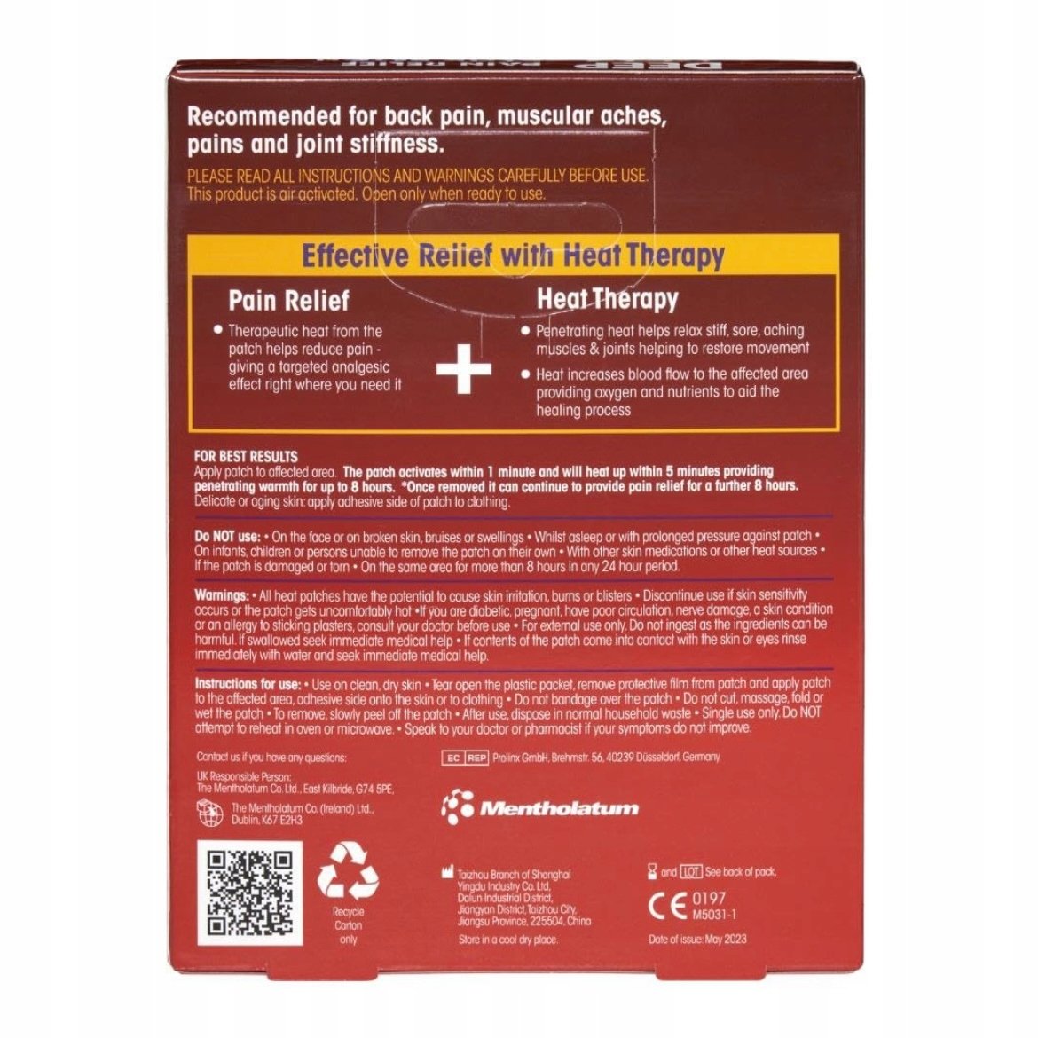 Deep Heat to przeciwbólowe kompresy samogrzejące, które złagodzą bóle mięśni pleców, karku, barków oraz ramion i przyniosą natychmiastową ulgę. Okłady są tak stworzone aby pozwalały na swobodne poruszanie się, możesz bez problemów wykonywać przeróżne czynności podczas gdy kompres dostarcza ciepło.