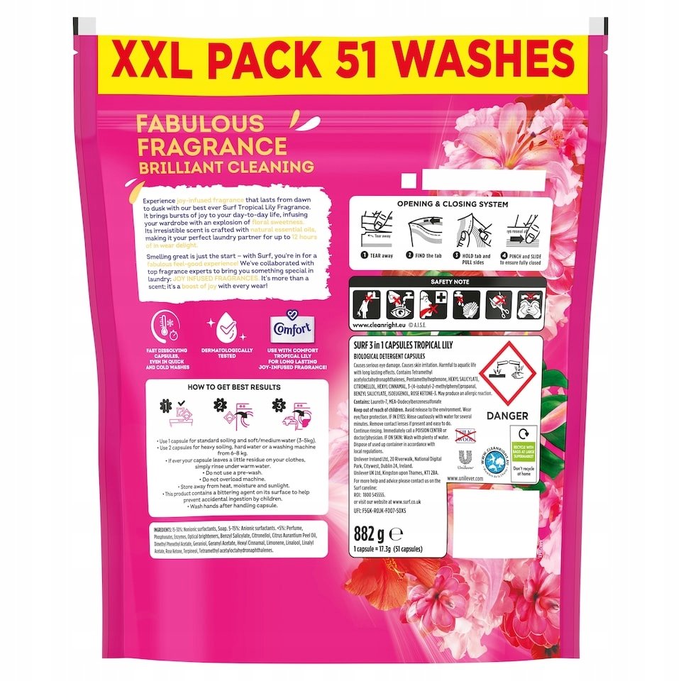 Kapsułki Surf Tropical Lily są idealne dla każdego, kto szuka skutecznego detergentu, który nie tylko doskonale czyści, ale także pozostawia ubrania intensywnie świeże i pięknie pachnące przez wiele godzin. Są proste i wygodne w użyciu, doskonale sprawdzają się w codziennym zabieganym życiu.