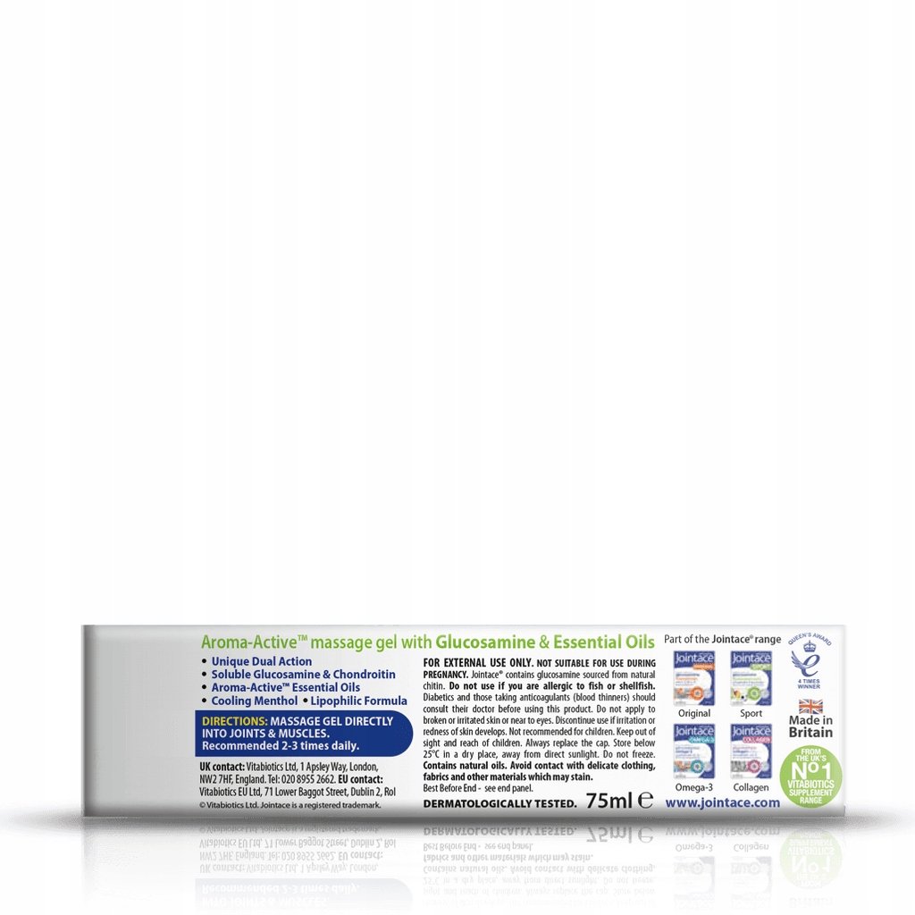 Jointace to żel do masażu na bóle stawów i mięśni. Zawiera olejki eteryczne, Glukozaminę i Chondroitynę Niedobory chondroityny powodują zaburzenie prawidłowego funkcjonowania stawów. badania wskazują, że glukozamina podawana w połączeniu z chondroityną zapobiega zwężeniu szpary stawowej. Kości nie ocierają się o siebie, gdyż są utrzymywane w prawidłowym położeniu względem siebie.