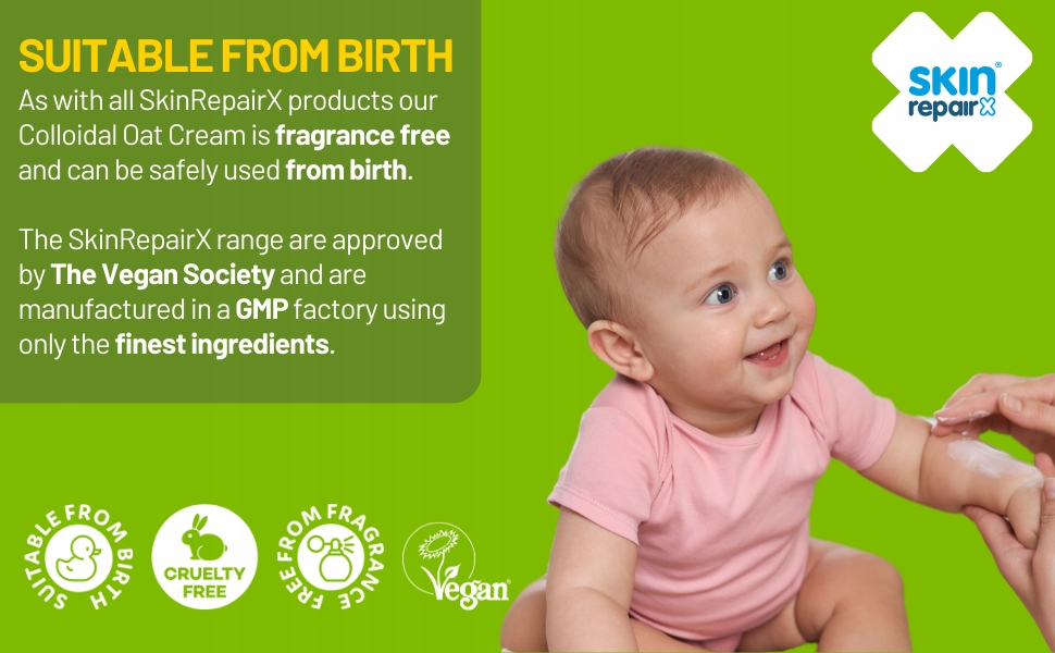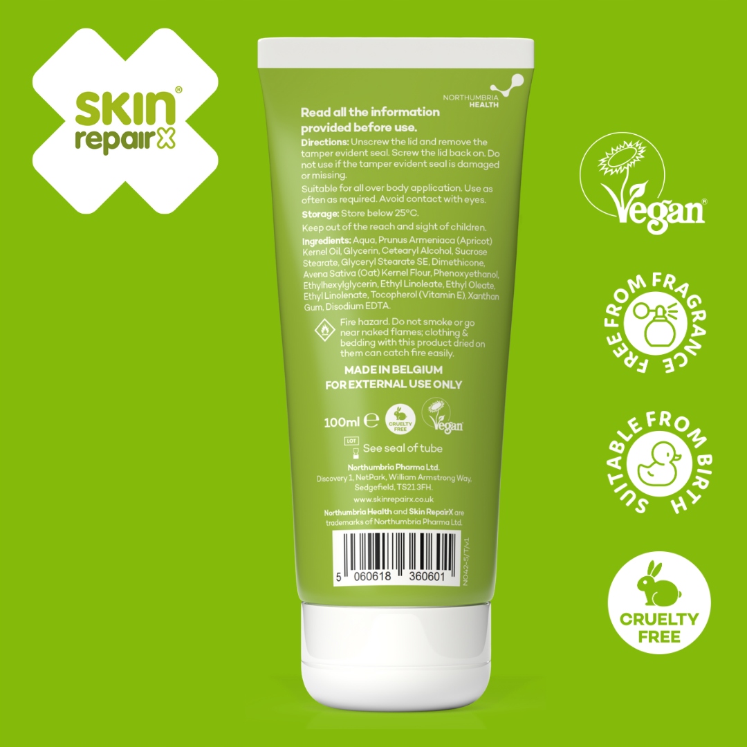 SkinRepairX Oat Cream zawiera drobno zmielone koloidalne płatki owsiane które naturalnie zapobiegają suchości i podrażnieniom, pomaga chronić barierę skórną oraz wyrównuje jej naturalne pH, pozostawiając skórę miękką i gładką. Krem pomaga skórze utrzymać jej naturalną elastyczność i nawilżenie. Odżywia nawet najbardziej suchą skórę i łagodzi skutki schorzeń takich jak egzema i łuszczyca.