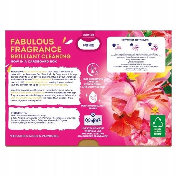 Kapsułki do prania Surf Tropical Lily oferują kwiecisty zapach wzbogacony naturalnymi olejkami eterycznymi, zapewniając do 12 godzin świeżości podczas noszenia ubrań.